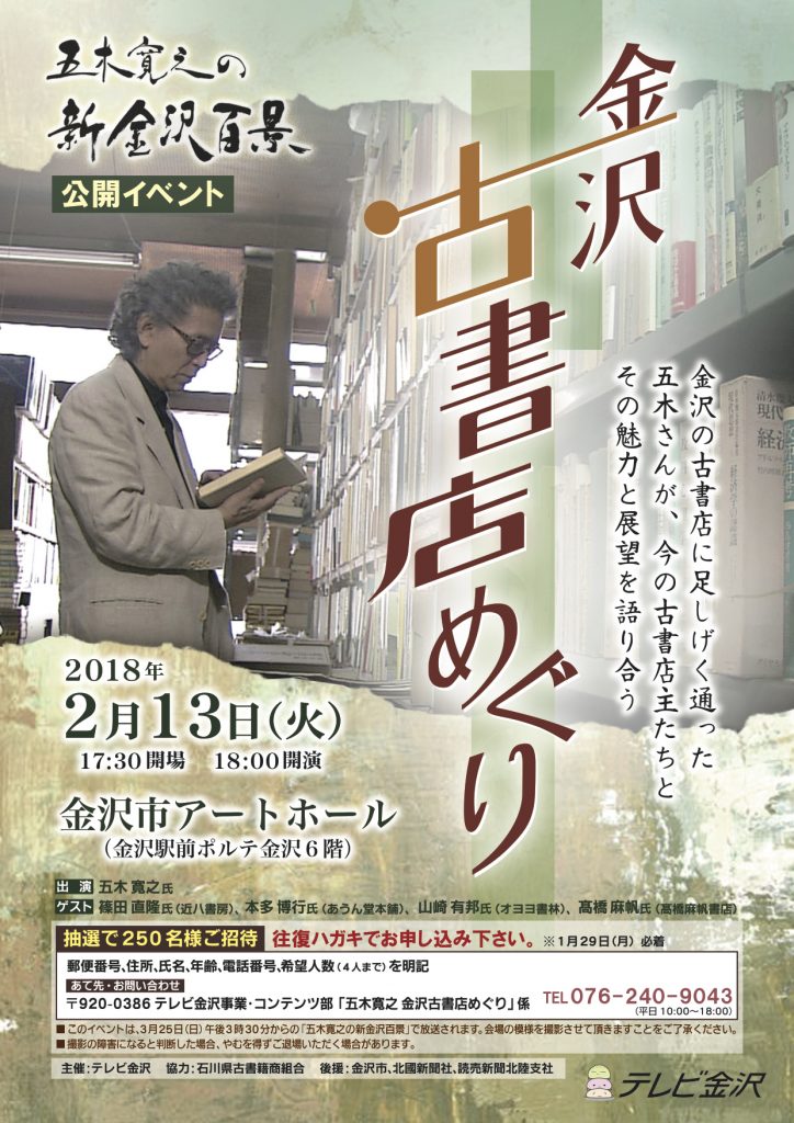 この度、テレビ金沢さんからお声掛けを頂き、五木寛之の新金沢百景という番組の公開イベントとして、2月13日(火)18時より金沢市アートホールにて「金沢古書店めぐり」題された公開録画が行われます。